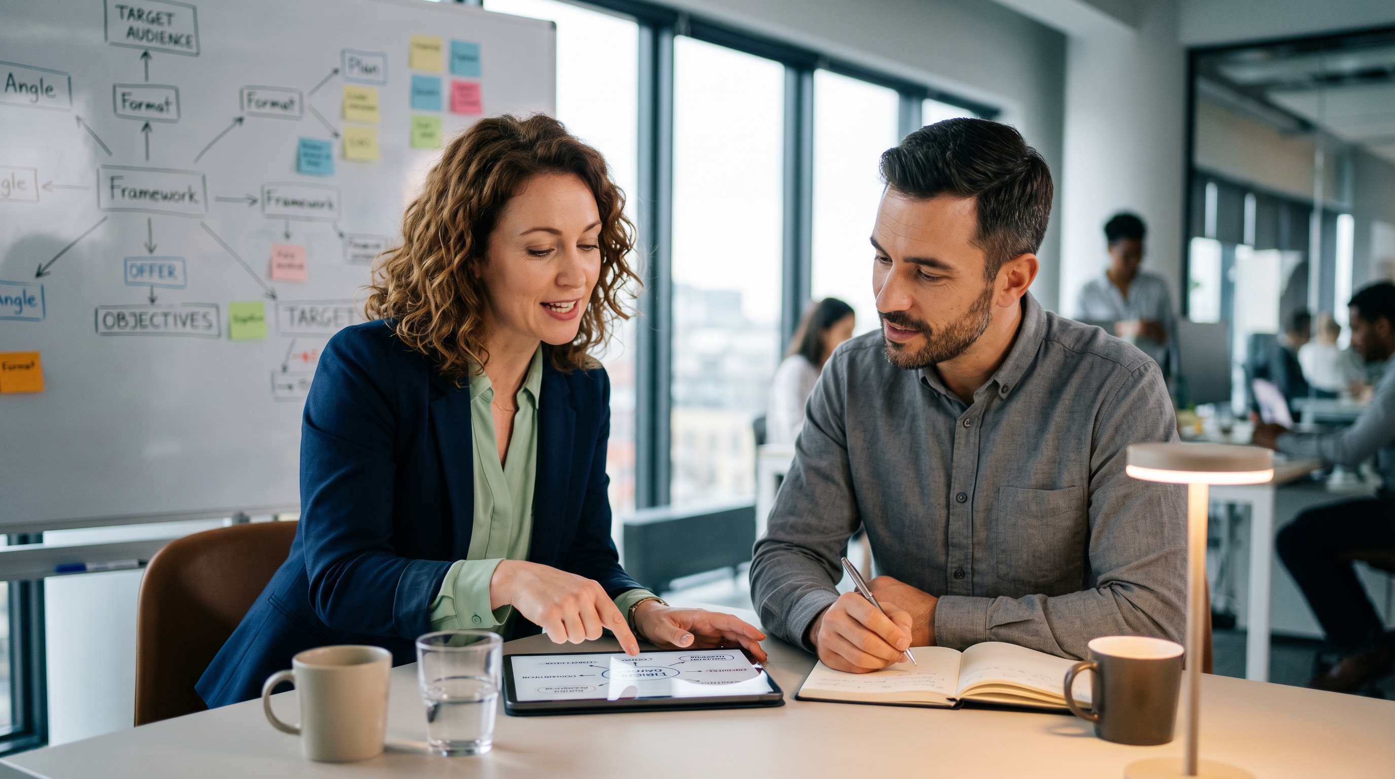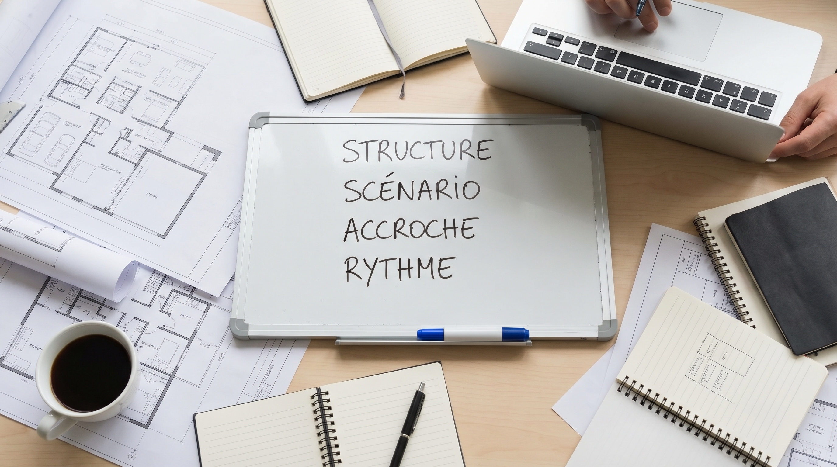 On définit l'accroche, la structure du message, le ton, les séquences clés et le rythme pour capter l'attention dès les premières secondes et guider le spectateur jusqu'au message final.